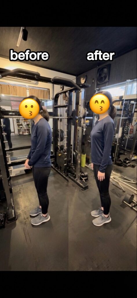反り腰の状態でスクワットを繰り返したことで、逆に前ももの筋肉が張り出している状態。まずは静的ストレッチで関節の詰まりを取り、骨盤を正しい位置にリセット。その上で歩き方の癖を修正した結果、無理な食事制限なしに脚のラインが劇的に整いました。